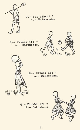 The author deals first with the nine classes of words in Bemba. Page 5 is typical of this part of the book, delightfully portraying real life people, items and activities, albeit in somewhat crude ink drawings.