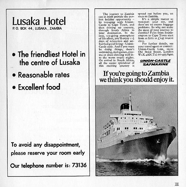 Advertisement for the Ridgeway Hotel, Lusaka, the venue for important gatherings as well as visiting dignitaries.